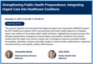 The North East Regional Urgent Care Association (NERUCA) has been selected to present at the upcoming National Healthcare Coalition Preparedness Conference (NHCPC). The presentation will highlight NERUCA’s collaboration with local Departments of Health—such as the New York City Department of Health and Mental Hygiene (NYC DOHMH)—and healthcare coalitions, including the NYC Health Care Coalition (NYCHCC), to strengthen healthcare system readiness and enhance community resilience.